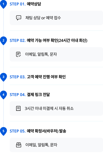 - 예약 요청 시 카드 결제 링크 또는 입금 계좌를 안내드립니다.
