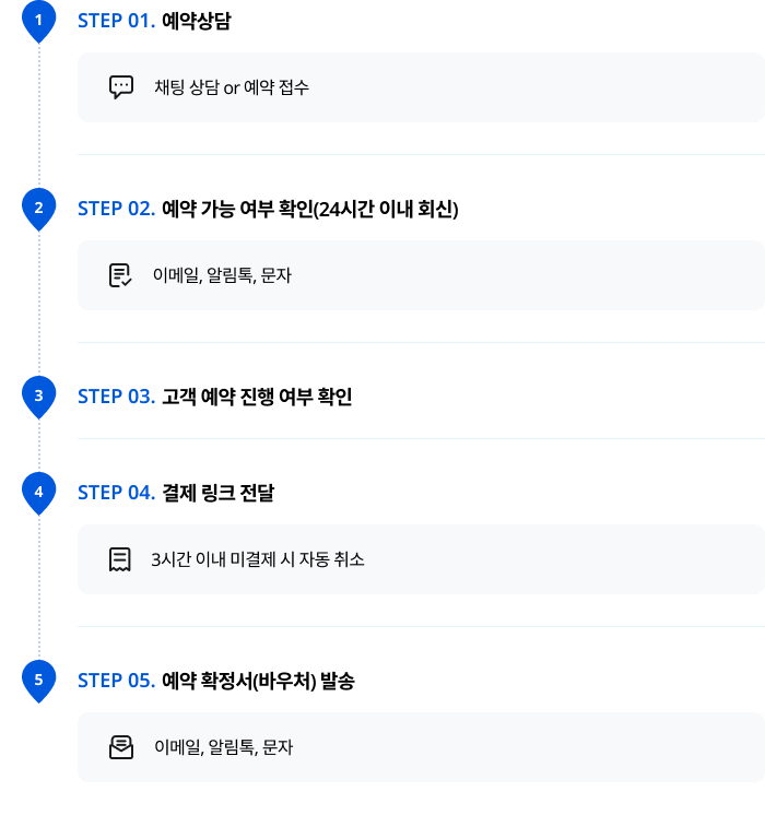 · 예약 접수를 클릭하시거나 네이버 1:1 채팅 상담, 카카오톡 상담으로 먼저 문의하시면 예약 요청 양식을 작성하실 수 있습니다. (네이버 로그인 필요)